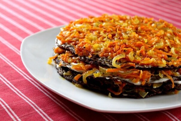 5. Формируем торт. Для этого на тарелку кладем корж, на него тонкий слой майонеза, сверху — тонким слоем лук с морковью, следующий корж, и так далее. Если коржей много, для удобства сделайте два тор