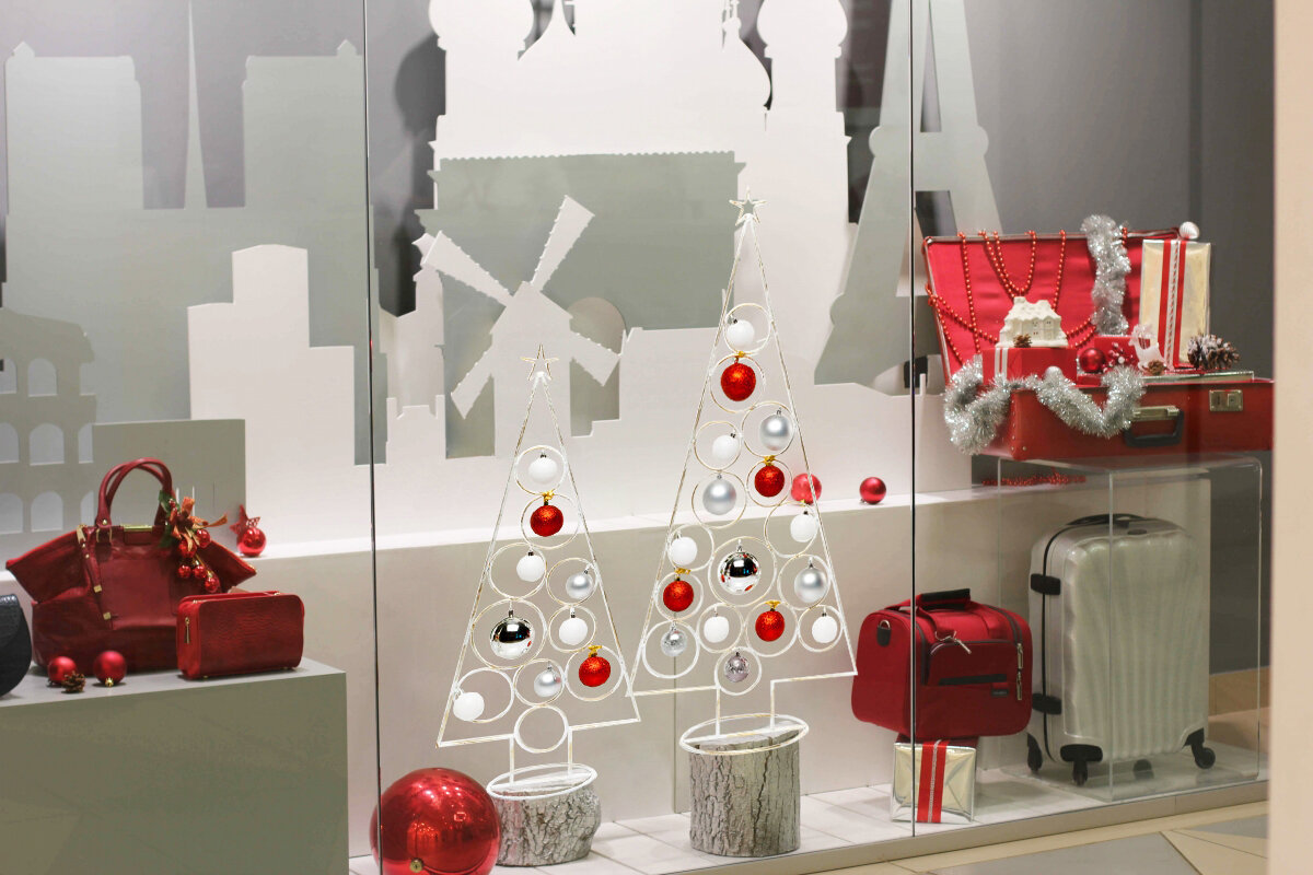 Близятся новогодние и рождественские праздники. Покупательсткая способность в это время возрастает в несколько раз, но вместе с ней увеличивается конкуренция. Каким должно быть новогоднее оформление витрин и каких основных правил стоит придерживаться при создании праздничной композиции - рассказываем и показываем. Традиционный колорит новогодней витрины - это белый, красный, синий, серебро и золото. Мы рекомендуем использовать классическую цветовую "гамму трёх" - два близких по тону цвета и один контрастный. К примеру, белый, серебряный и красный. Так витрина не будет выглядеть перегруженой, будет смотреться гармонично и концептуально. Не старайтесь продемонстрировать весь ассортимент новогодних новинок магазина - больше, не значит лучше. Уделите внимание новогодней композиции витрины - если она "зацепит" клиента, то он обязательно увидит и ваш товар, даже если его будет немного. Фокус очень важен при построении композиции витрины. Точка, на которую обращаются взгляды прохожих. Т