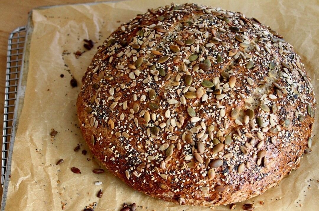 2. В полученную смесь вливаем кефир и замешиваем тесто. 3. Семена кунжута и льна слегка подсушиваем на сковороде или микроволновке. Добавляем к тесту и снова его перемешиваем. 4. Присыпаем противень мукой. Выкладываем шар из теста и делаем несколько неглубоких надрезов, сверху слегка присыпаем мукой. 5. Выпекаем 40-40 минут в хорошо разогретой до 200 градусов духовке. Приятного аппетита!