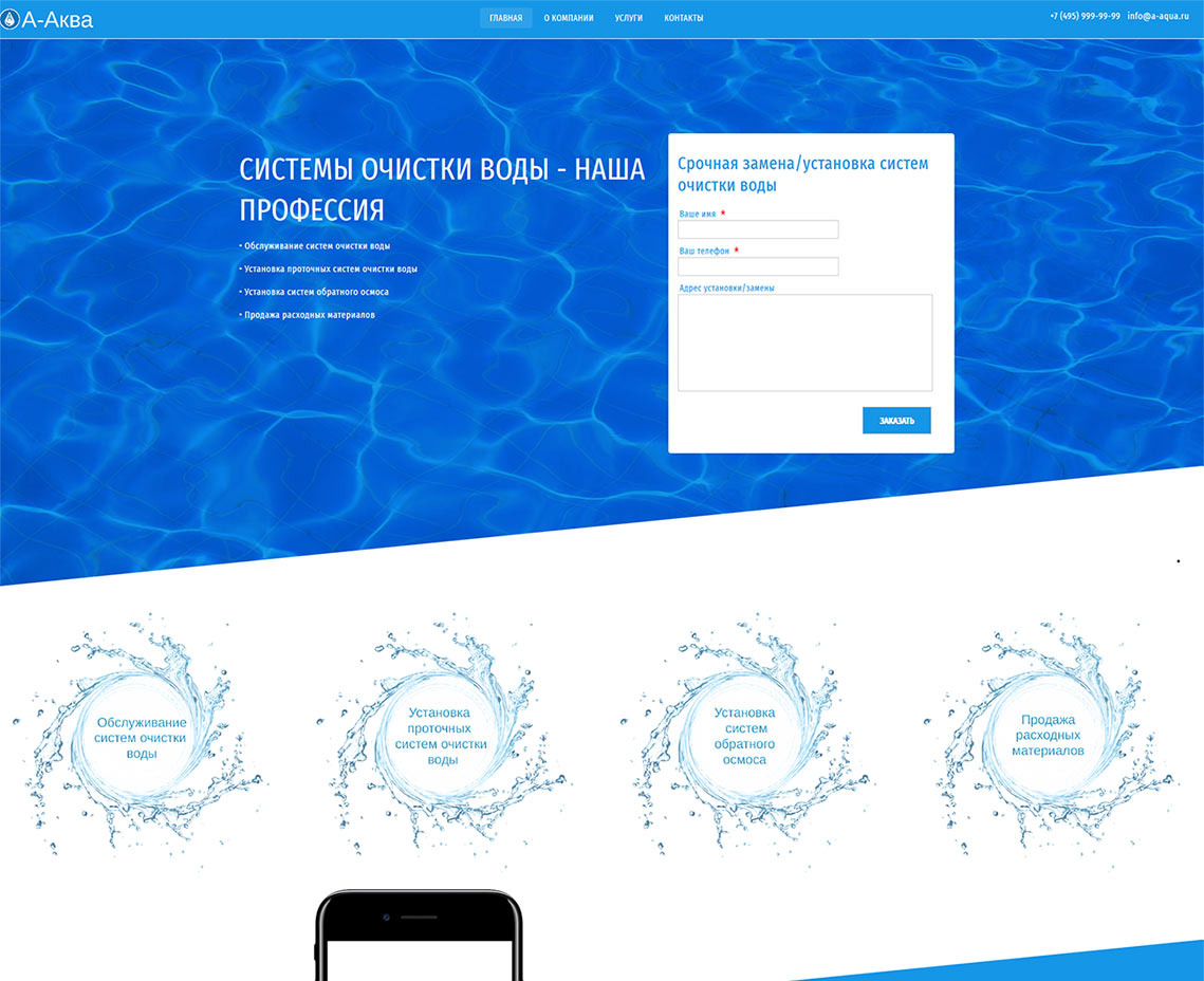 Разработка сайтов для наших специалистов, это процесс творческий и очень увлекательный, они словно погружаются в ту атмосферу, которая должна присутствовать в офисе компании заказчика. Эту тенденцию ярко иллюстрирует данный сайт, на котором мы видим весь смысл компании, занимающейся системами очистки воды. Дизайн сайта такой же чистый и прекрасный как вода, прошедшая через систему фильтрации. Разработка сайтов такого класса идет по индивидуальному плану и включает в себя все необходимое для качественной и комфортной работы пользователя, нужная информация под рукой, кнопки интуитивно понятны.