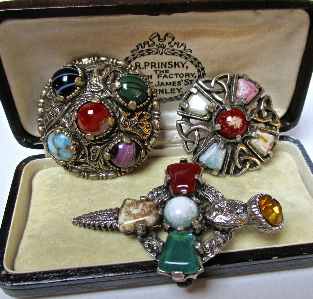 Броши, найденные в Шотландии, относятся ко 2 столетию до нашей эры, а простые кольцевые броши ценились в Средние века как талисманы. Женщины пристегивали свои шали серебряными или бронзовыми кольцами и дисками, мужчины из кланов прикрепляли свои пледы к плечу. С 16 века большие броши с кристаллами и содержащие куски реликвий, отсылали к дохристианской традиции charmstone, используемых для излечения больного, -- и это уже более близкий прототип сегодняшних брошей с полудрагоценными камнями. Тонко украшенный золотой гарнитур из ожерелья, подвески и пряжек с агатами, представленный в 1782 году в Edinburgh's National Museum of Antiquities of Scotland в Эдинбурге, свидетельствует о раннем использовании шотландских камней в декоративных украшениях, но именно любовь королевы Виктории к Шотландии сделала это модным.
