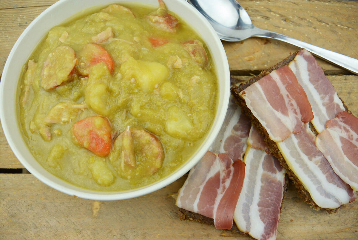 Ингредиенты: 300 гр. гороха, 1 луковица, 1 морковь, 4 стеблей сельдерея, 150 гр. свежего бекона, 150 гр. копчёного бекона, 250 гр. подкопчённой колбасы, соль, молотый чёрный перец, лавровый лист Способ приготовления: Горох высыпать в чашу и налить воды, замочить горох и оставить в воде на ночь. На следующий день промыть горох и переложить его в кастрюлю, поставить кастрюлю на плиту и варить до мягкого состояния гороха. Будет образовываться пенка, её нужно снимать. Лук, морковь, стебли сельдерея вымыть. Почистить лук и морковь. Порезать лук, морковь, стебли сельдерея на средние кусочки. Бекон порезать на ломтики. Затем в кастрюлю добавить нарезанные овощи: лук, морковь, стебли сельдерея и 1 ломтик бекона. Также дополнить суп солью, молотым чёрным перцем, лавровым листом, налить воды столько, чтобы она закрывала овощи, можно использовать мясной бульон. Суп нужно варить до готовности моркови, как только морковь будет готова, аккуратно снять с плиты кастрюлю, вынуть из супа лавровый лист