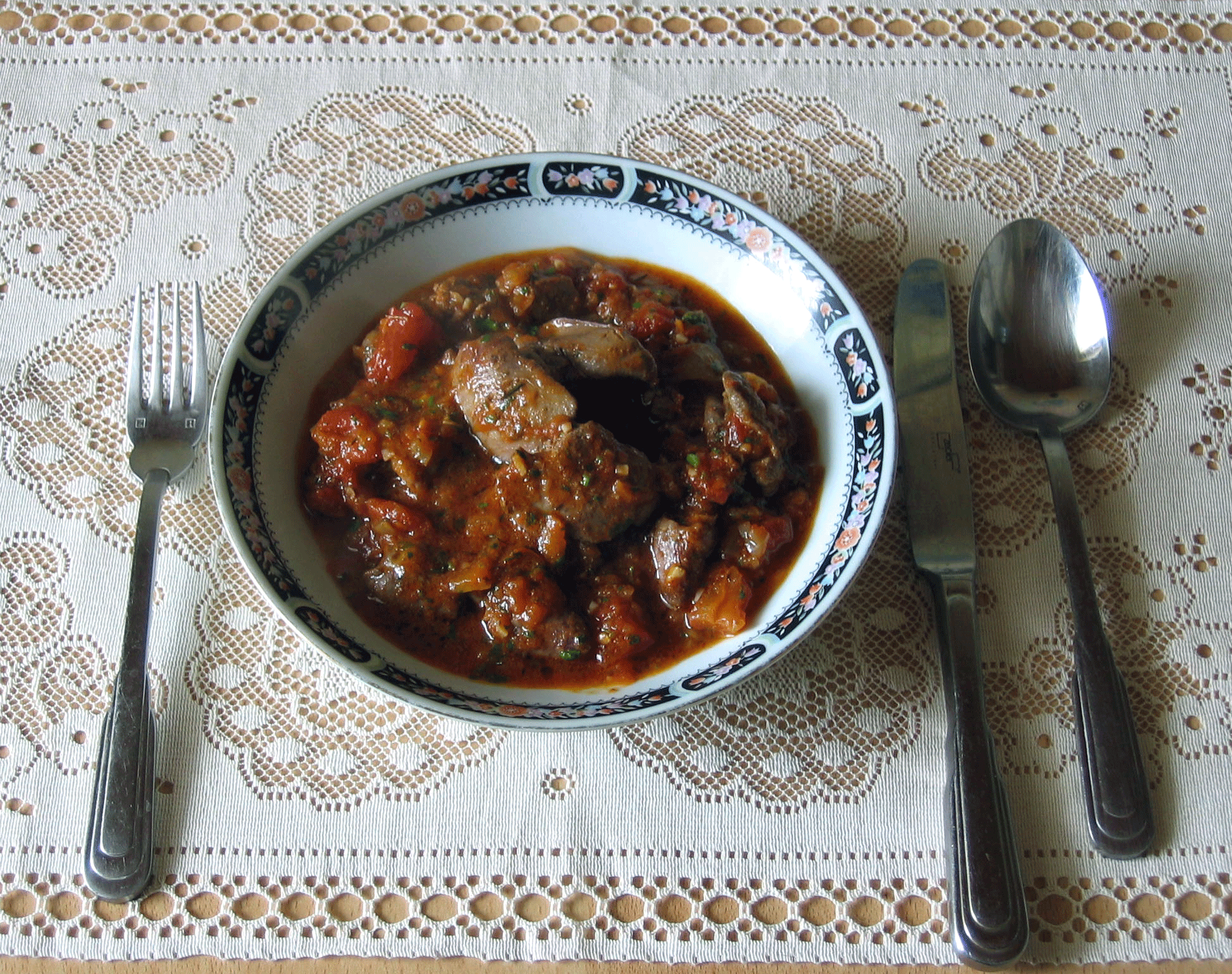 Пару дней назад я проводил эксперимент «Обед из двух блюд за один час». Ожидаемая реакция недовольных женщин побудила меня опубликовать еще один рецепт, который никогда вам не будут готовить по банальной причине – «тебе не понравится». А мне такие блюда очень нравятся. Сегодня в моем меню - рагу из куриных потрошков Ингредиенты Потрошки куриные: сердце, печень, желудочки, - примерно по 300 гр. Банка очищенных томатов. Две головки лука. Два зубчика чеснока. Зелень - много. Морковь. Специи. Приправы. Приготовление. Лук и морковь нашинковать, пассировать до готовности. В ту же сотейник положить подготовленные потрошка. Поперчить, добавить специи по вкусу, солить. Тушить 10 минут. В конце тушения, когда потрошка почти будут готовы, добавить половину зелени и чеснока. Мелко порезанные томаты, заранее очищенные от кожицы, выложить в сотейник. Продолжать тушить до готовности 15 минут. Положить оставшуюся зелень. Закройте крышкой и снимите с плиты. Совет. Не бойтесь эксперименти