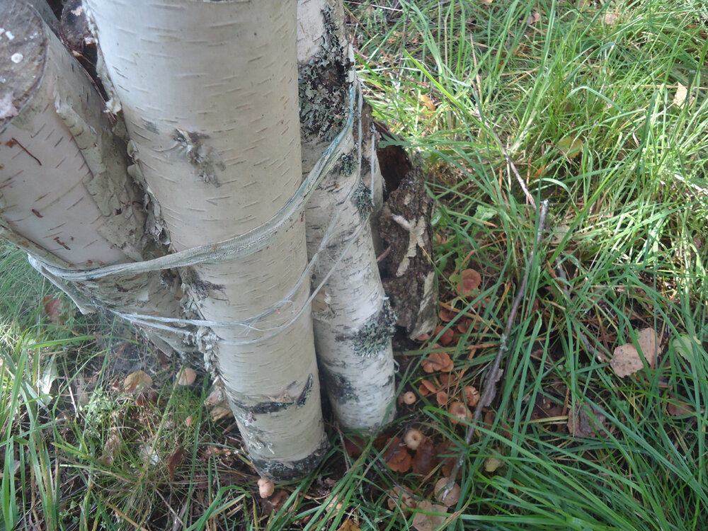 Закладываем плантацию опенка. Для начала нужно найти дикий опенок и одомашнить. То есть принести обрубок пня, из которого растет опенок, домой. Лучше конечно не совсем домой, а на участок в некотором отдалении от дома. Ибо опенок - достаточно агрессивный сапрофит и может перекинуться на деревянные конструкции дома. Искать пень на котором растет опенок удобнее всего в сезон. Для летнего опенка- в середине лета, для осеннего в конце августа-начале сентября. Забирать из леса можно и в другое врямя, главное раньше заметить, где растет правильный опенок. Также нужно заготовить обрезки деревянных чушек, на которых будет расти опенок. Породы не особенно важны, но предпочтительно лиственные- на них заражение лучше проходит. У меня были березовые. Вот так сажал в прошлом году: Лучше всего заготавливать зимой, так древесина более сухая и антисептическое влияние живого слоя дерева не так проявляется. Нарезаем дерево на чушки длинной примерно 50 см и увязываем в искусственные пеньки. Под пенек,