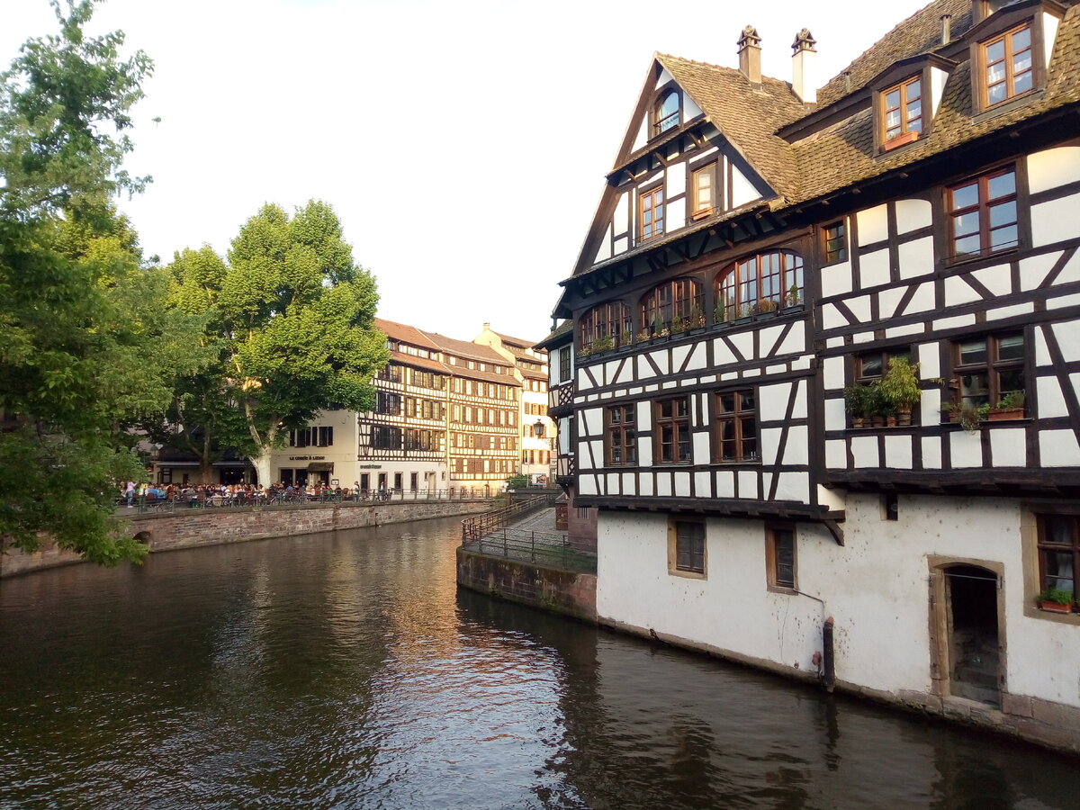 Мы немного изменили маршрут поездки. Из-за отсутствия билетов на автобус, на котором собирались поехать в Реймс, мы отказались от поездки в него, забронировали проживание в Страсбурге и в итоге, получили здесь почти сутки, вместо десяти часов. С ценами на транспорт в Страсбурге всё чудесно: проездной на сутки, по которому могут проехать 2-3 человека стоит 6 евро! На все виды городского транспорта. Мы поехали автобусом в "Маленькую Францию" - самый романтический район Страсбурга, но по пути решили заглянуть на вокзал... Так он выглядит со стороны улицы. Причудливо и ярко. Если же зайти за эти стёкла, то там он выглядит несколько иначе. И вот "Маленькая Франция": Это один из старейший из кварталов города. Многие дома построены в эльзасском стиле фахверка. Эльзас - историческая область Франции, столицей которой и является Страсбург. Интересный мост. Когда по каналу плывёт судно, его перекрывают от пешеходов, после чего он проворачивается на 90 градусов, пропускает судно и возвращается в