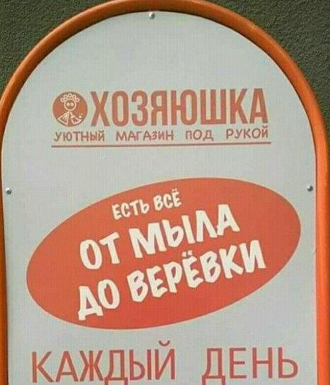Привет, меня зовут Сергей Федулов, и здесь на моем канале вы найдете мои авторские статьи о маркетинге. Сегодня я заглянул в свой маркетинговый архив и подумал: о!!, это я еще не публиковал! Смотрите. 1. Веревка и мыло Конечно, продемонстрировать ассортимент - это мысль правильная и нужная, но не таким же образом. Мыло и веревка - это история о том, как повеситься. Что за маркетолог это придумал? )) 2. Бананы и киви Если ты решил забабахать рекламный щит, то уже не поленись - проверь, как он выглядит и что на нем написано. А то пишем киви, рисуем бананы. Кто это делает? )) 3. Лев Толстов Правда, я не знаю, кто этот Лев Толстов, но остановку в честь него назвали. И вывеску деньги потратили - распечатали. Кто все эти люди, фигачащие такие штуки? )) 4. СУмоЧКА А вот в этом названии явно прослеживается еще 1 слово. Так понимаю, это уважительное обращение к своей целевой аудитории )) 5. Навоз Приглашаются все желающие, кому навоз на хлеб намазать. Это невероятное блюдо, которое не найдешь
