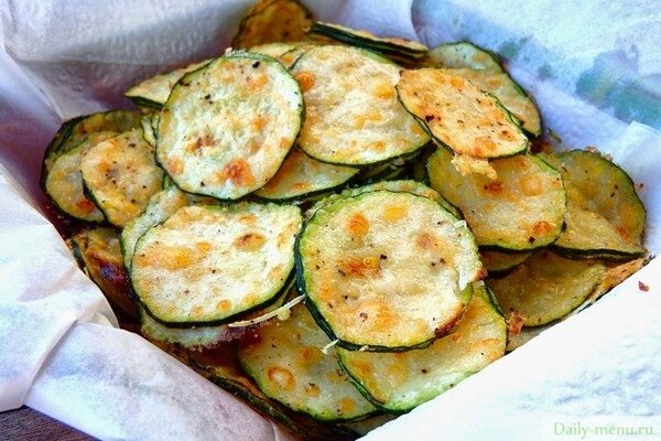 Чипсы, которые нам предлагает вездесущая реклама - мусорная еда, ничего, кроме вреда, организму не приносящая. Сделайте домашние полезные чипсы, которыми приятно и полезно похрустеть! На 4 порции по 150 г потребуется: 😊 2 маленьких кабачка (примерно 400 г), 😊 1 яйцо, 😊 1 ст.л. молока, 😊 3 ст.л. цельнозерновой муки, 😊 80 г сыра, 😊 щепотка сушёного чеснока, 😊 перец молотый, 😊 соль Приготовление: 1. Яйцо взбить с солью и молоком, отдельно смешать муку с сушёным чесноком и перцем, добавить немного соли. 2. Кабачки нарезать тонкими кружочками, обмакивать в яичную смесь и панировку, выложить таким образом все кабачковые кружочки на противень. 3. Сверху на каждый кружочек посыпать немного тёртого сыра. Запечь кабачки в очень горячей духовке (220-230 градусов) около 20 минут. Следить, чтобы не подгорели. К кабачкам можно подать сметанный соус. Приятного аппетита! Еще рецепты для вашего стола: Закусочные солененькие кексы для приятного застолья