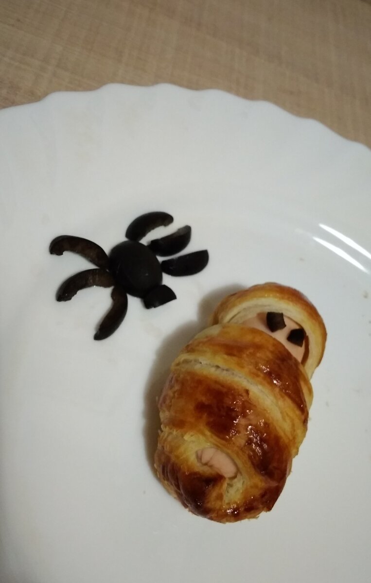 Быстрый рецепт для любимых деток из любимых продуктов, который понравится и взрослым. Предлагаю приготовить вариант сосисок в тесте "Мумия". Ингредиенты: слоенное тесто - 100гр сосиски "малютки" - 6шт маслины для украшения яйцо для смазывания Способ приготовления: 1. раскатать тесто и разрезать на длинные полоски 2. очищенные сосиски завернуть в тесто оставив пробел с одного края - там будет рожица "мумии" 3. выложить подготовленных "мумий" в форму для запекания и смазать взбитым яйцом для румяной корочки. 4. выпекать в разогретой духовке при 180℃ 15минут 5. готовым "мумиям" сделать глазки из маслин Время приготовления - 25 минут Количество порций - 6 мумий (3 порции) Это блюдо отлично впишется на праздничный стол Хэллоуина, так же как "Осьминожки" из сосисок со спагетти, которые можно приготовить пока выпекаются "Мумии".
