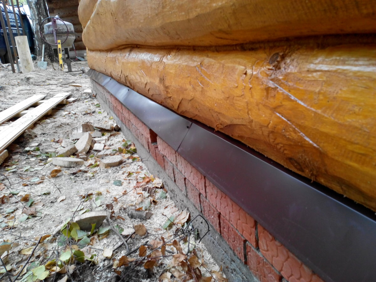 Чтобы Баня радовала Вас как можно дольше необходимо максимально защищать первый венец сруба или бруса. Не для кого не секрет, что самое быстро гниющее место в бане это ПЕРВОЕ БРЕВНО. Для того чтоб под него попадало меньше воды, нужно хорошенько его защитить. Для этого мы используем железные отливы. Можно придумать и что то другое, например пластик или дерево. Но мы делаем железо, его легко монтировать и оно доступно. Вы скажете, что тут мудреного? Взял железа, нагнул и прикрутил. Но не тут то было. Сейчас попробуем и в этом пункте дать ряд своих советов проверенных временем. Мы не используем заводские отливы, которые продаются повсеместно. Как и в случае с полками для парной, мы пошли своим путем. Смотрите на фотках как выглядят стандартные отливы. Они загнуты неправильно. Понятно, что так монтировать легче, но герметик отслаивается и под отливы попадает вода. Что приводит к гниению бани. Мы же штробим бревно по всему периметру и загибаем отлив в обратную сторону. Тем самым вода, стек
