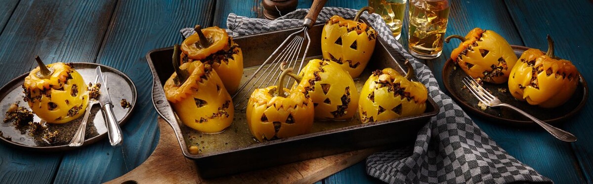 Чтобы ощутить весь дух праздника Хэллоуин, предлагаем вам приготовить «страшное блюдо» по нашему рецепту – фаршированные головы Франкенштейна. Они выглядят ужасающе, но очень вкусные и сытные. Дети будут в восторге! Для приготовления на 6 персон потребуется: - 2 маленьких сладких картофелины - 4 ст.л. оливкового масла - 6 больших желтых, красных перцев - 350 г черного или красного киноа - 200 г копченого тофу - 1 большой лук - 2 зубчика чеснока - 100 мл овощного бульона - куркума - тмин - лайм - соль, перец по вкусу Способ приготовления: 1. Вымойте сладкий картофель, обмажьте его 2 ст.л. масла и запекайте в духовке примерно 25 минут при температуре 180 ° C. 2. Вымойте перцы, вырежьте крышку зигзагообразным рисунком и удалите сердцевину. Вырежьте страшные лица. 3. Промойте киноа тщательно и варите в двойном количестве воды до полу готовности. Тофу нарежьте кубиками. 4. Очистите лук и чеснок и порежьте мелко. Обжарьте лук в масле, добавьте чеснок и жарьте