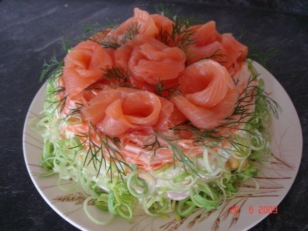 Если хочется удивить гостей чем-то необычным и оригинальным - приготовьте этот замечательный салат "Королевская шубка". Уверяю, этот салат сметут со стола за считанные минуты и не останется ни ложки! Приготовление: Сначала нам необходимо сварить 3-4 картофелины, 2 моркови, 4 яйца. Затем начинаем собирать салат. Лучше всего использовать плоское блюдо. Салат слоеный, каждый слой смазываем майонезной сеточкой. Если кажется, что майонеза будет много, смазывайте не каждый, а через один. Солить салат не нужно. Первым слоем идет порезанный кубиками картофель. Второй слой - любая красная соленая рыбка (форель, семга, горбуша и т.д.), так же нарезанная кусочками. Рыбы понадобится 150-200 гр. Немного откладываем в сторону для украшения сверху. Третий слой - измельченная луковица. Четвертым слоем идут креветки (200 гр), пятым слоем - порезанные яйца. Шестой слой - одна пачка нарезанных крабовых палочек. Седьмой слой - консервированная кукуруза (1 банка). Восьмой слой - тертая морковь. Сверху смаз