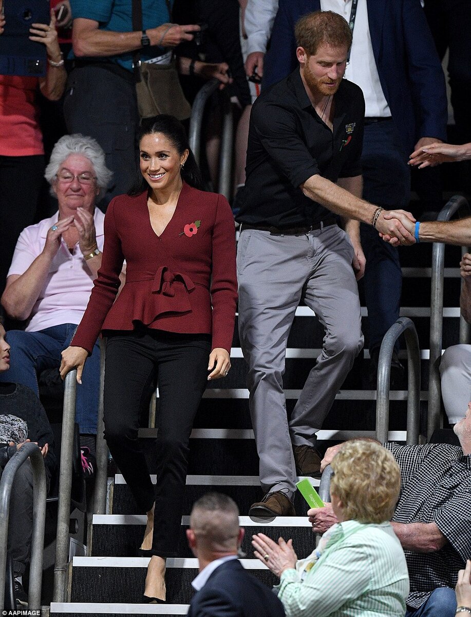 В последний день соревнований Игр непокоренных Гарри и Меган посетили финальный матч по баскетболу между командами США и Нидерландов. Они явились уже после начала матча. Разумеется, бывшая актриса идет впереди принца. Приятно видеть, что Меган убрала волосы. Но выбор цвета верхней части гардероба странен для ее цвета лица. Да и фасон не совсем подходящий, он явно для более полной груди. Поэтому на ходу пришлось его править и закалывать блузку булавкой. Плюс непонятна страсть Меган к коротким жакетам, которые подчеркивают ее не самые идеальные, мягко говоря, бедра. Обычно, такие квадратные бедра женщины предпочитают прятать. О неуместности каблуков на спортивном соревновании можно даже не упоминать. Это не первый раз, когда Меган надевает каблуки в спортивный зал. Гарри же был одет в рубашку с логотипом Игр. Это, конечно, более подходящий наряд для спортивных соревнований среди инвалидов, чем обтягивающие штаны Меган. Пока пара спускалась по лестнице к своему месту, все внимание было