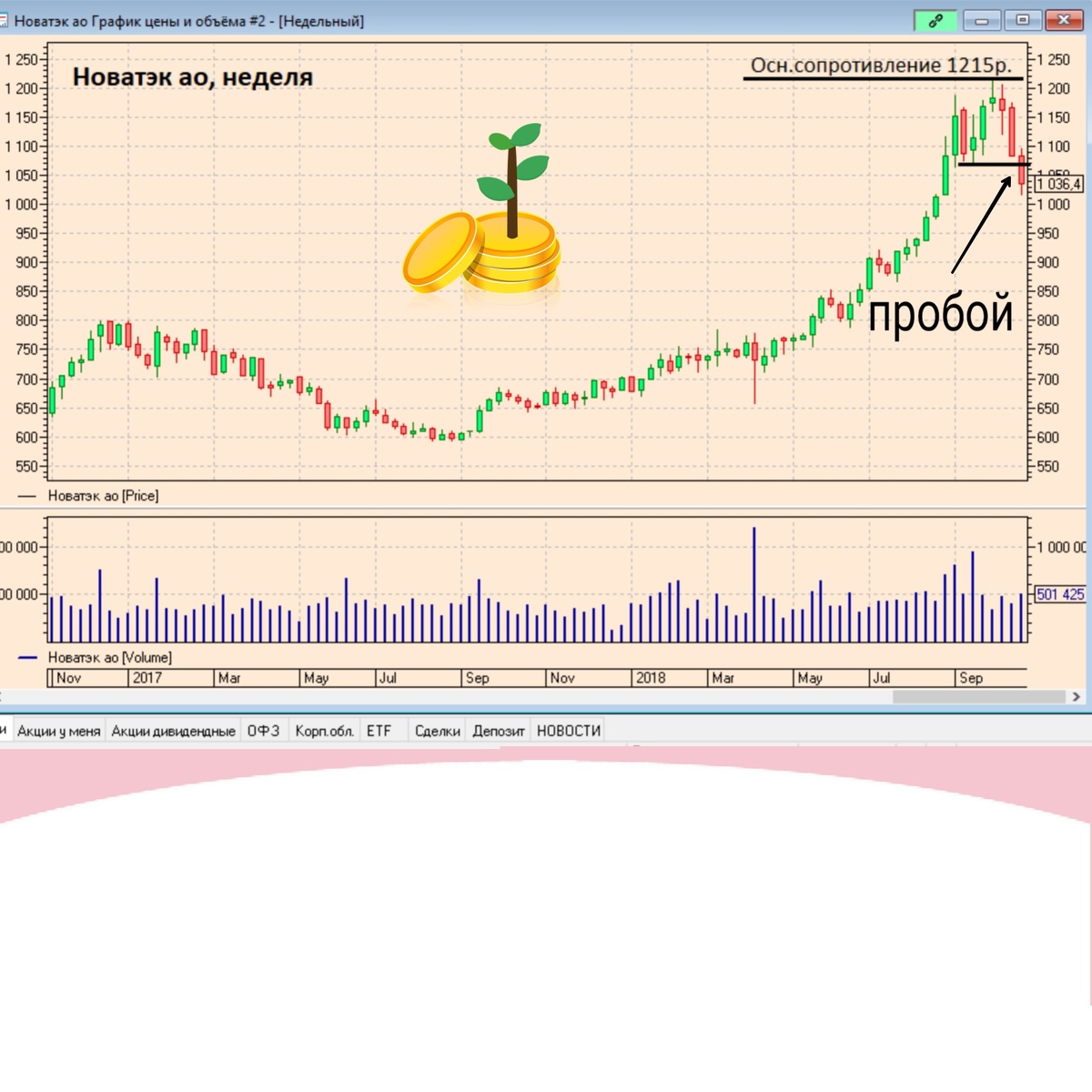 📆Вот и закрылась очередная торговая неделя (22.10-26.10 2018г.), и мне в голову пришла идея начать новую рубрику «Обзор рынка за прошедшую неделю», в которой я буду публиковать ключевые разворотные моменты в акциях на недельном таймфрейме. ☝️Чтобы понять логику моих размышлений, посмотрите бесплатный курс по ссылке на YouTube www.youtube.com/playlist?list=PLWwwLQ2YQtBJsCgP8OSIGz0A4_mD7dqbA, если ещё не смотрели. 📊Итак, информацию буду выдавать только по тем акциям, по которым на этой неделе сформировался разворотный сигнал. Если сигнала на недельках в акции нет, то писать про такую бумагу я не буду. 📍Повторюсь, вся информация ниже относится к недельным таймфреймам и носит исключительно информационный характер. 👉На этой неделе ключевая точка была зафиксирована в следующих акциях: ➡️Новатэк ао – зафиксирован момент начала падающей тенденции; новая недельная волна падения стала больше предыдущей волны роста; основное сопротивление 1215р. Открытый риск на момент закрытия рынка -14,7%.