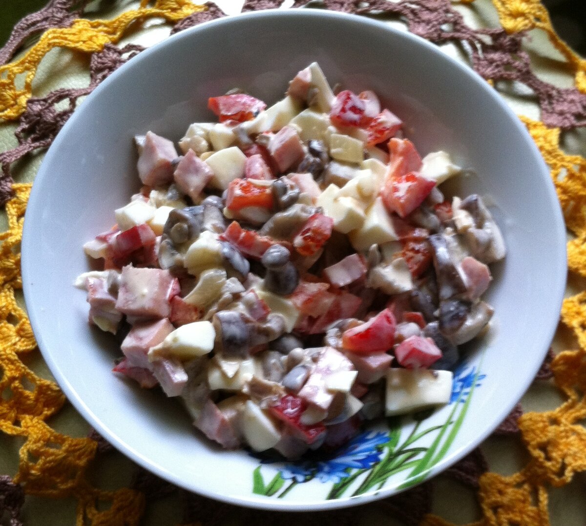 Ни для кого не секрет, что осень - грибная пора в средней полосе России. Но этот сезон скоротечен и зависит от капризов погоды. Чем больше дождей, тем больше грибов. Я не являюсь заядлым грибником, но в некоторых видах лесных деликатесов трудно ошибиться. Теперь, собственно, сам рецепт. У меня были опята - дружные ребята, но можно взять любые отварные грибы. Горсть отварной курицы, 100 г полукопченой колбасы или ветчины (у меня была Балыковая), поллитровая банка отварных опят, 1 луковица, 3-4 яйца, 1 большой болгарский перец (или 2 средних), 100 г майонеза. Грибы обжарить с луком, охладить, а потом все мелко нарезать кубиками. Отварить яйца. Так же мелко порезать яйца, курицу, колбасу и перец. Все смешать с майонезом. Можно посолить и поперчить по вкусу, но обычно ингредиенты уже соленые или острые. Приятного аппетита и удачной тихой охоты!