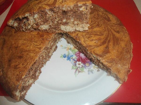 Добавьте в кефир взбитое яйцо, манную крупу и сахар. Всё тщательное перемешайте и оставьте массу на 1 час,чтобы манка набухла. Затем добавьте маргарин или сливочное масло, муку и соду (ГАСИТЬ НЕ НАДО!). Хорошо перемешайте до однородной консистенции. Затем разделите тесто пополам, в одну половину добавьте какао-порошок. Смажьте форму для выпечки сливочным маслом и заполните её, чередуя тесто с какао-порошком и без него. Для этого лейте тесто попеременно строго в центр формы: 2 ст.л. тёмного теста, 2 ст.л. светлого. Поставьте выпекаться пирог в разогретой духовке до 180-200 градусов на 30-35 минут. Го