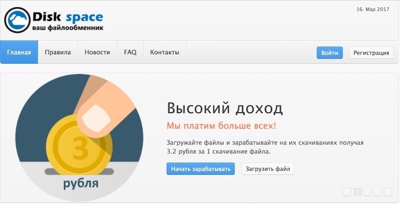 Хочу рассказать о заработке денег на Diskspace. Disk space- это файловый обменник, который служит для хранения файлов. При скачивание файлов вам начисляется 3.2 рубля и данные ссылки вы можете размещать в любой социальной сети или же на любом сайте. Чем больше у вас людей скачает и тем больше вы сможете заработать денег. Деньги выводятся на вебмани и вот мой показатель И если вы хотите тоже зарабатывать, то вот ссылочка http://disk-space.ru/register/196007