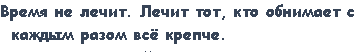 Вот решила поделиться своим мнение и ощущениями , прочитала я эту цитату: Я часто приходила к этому, что действительно время не лечит, ты наоборот себя больше накручиваешь, думаешь: " а может всё вернуть, простить слова, поведение человека, ты же уже привыкла к этому". А потом ты встречаешь другого, который тебя понимает, ценит, относится нормально к твоим истерикам и старается не показывать свой характер и сразу становится легче.