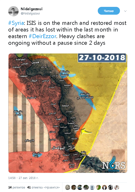 "Полный крах боевиков SDF/ YPG в мухафазе ДейрЕззор из-за массовых атак ИГИЛ на их позиции. Сообщается о бегстве американских и французских спецназовцев. Карма для иракского правительства, которое хотело иметь дело с боевиками SDF вместо сирийского правительства."- сообщается в твиттере нашего источника.