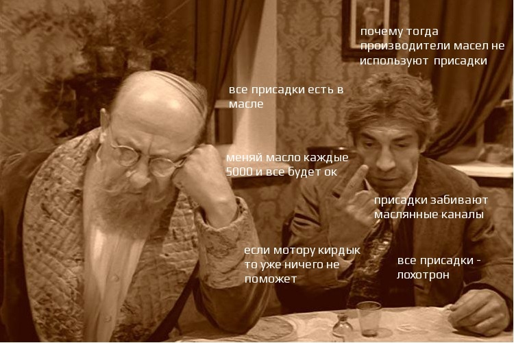 Это самая бредовая мысль, которая только может существовать. Сколько классов образования надо иметь чтобы нести такое? Какие ВСЕ? Что…ПРЯМ ВСЕ? Серьезно? И сколько их, ВСЕХ этих присадок? Внимание…правильный ответ. Во-первых — присадками называют только те препараты, которые направлены на УЛУЧШЕНИЕ ХАРАКТЕРИСТИК МАСЛА. Т.е. они взаимодействуют с маслами. Другой вид это всякого рода модификаторы трения. Третий вид это вообще технологии по восстановлению поврежденных и изношенных поверхностей и пар трения. Из выше сказанного заблуждения делаем вывод о проблеме работы головного мозга в части, отвечающей за логику. Если производители масел применяли бы весь пакет присадок, которые улучшают характеристики масел, то те же производители не продавали бы отдельно все эти присадки за кругленькую сумму. Это первое, что должно было смутить думающего человека. Дальше…Единственные модификаторы трения, которые применяют производители масла — это молибден, графит, тальк. Которые в свою очередь живут и работают первые 5000 км. Дальше…к технологиям по восстановлению пар трения относятся такие вещества как серпентин и другая технология, которая основана на нано частицах драгоценных металлов. Направлены они на образование слоев, с помощью которых компенсируют износ в парах трения. Теперь опять мы включим отдел логики в мозгу и сразу становится понятно, что применяя эти технологии каждые 10-15 тыс км, вы постоянно наращиваете слой в парах трения. В итоге вы получите излишне толстый слой который приводит к перегреву мотора. А снять этот слой уже не получится. Промывайте чем хотите т.к например слой, который образовывает минерал в несколько раз тверже и прочнее металла. И даже фреза при расточке цилиндров не берет этот слой вообще никак. Теперь вернемся назад и спросим еще раз, какие ВСЕ присадки уже есть в моторных маслах? Все необходимые для чего? Для продления жизни масла — да, но не восстановительные.