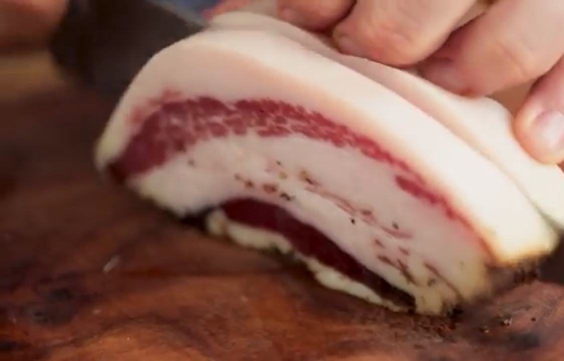 Жарим бекон на сковороде. Раздавим чеснок и добавим на сковороду для аромата. Перчим как следует - 1 чайная ложка по рецепту. И лучше всего перец смолоть самостоятельно.