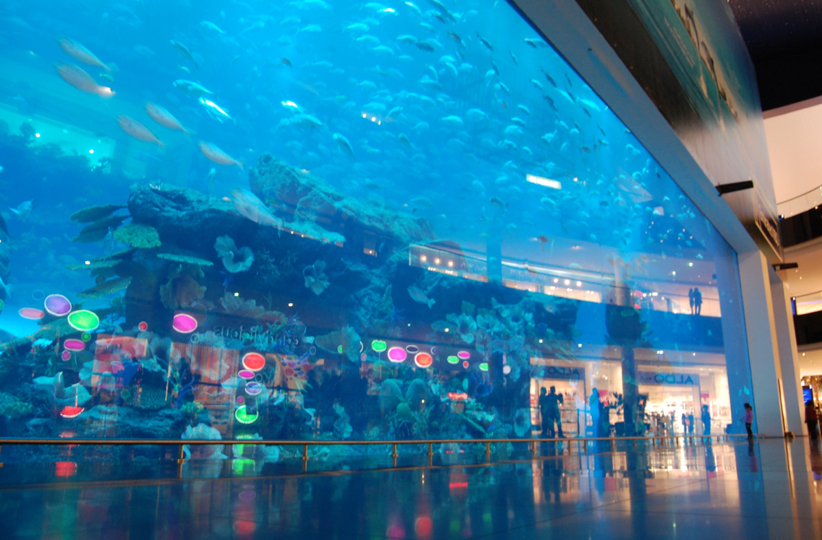 Назвать огромный резервуар для воды в Dubai Mall Aquarium - это преуменьшение, более актуальным является официальное название «Дубайский аквариум и подводный зоопарк». Гигантский бассейн простирается на высоту более 8 метров на трех этажах и составляет почти 33 метра в длину. Это делает его на 10 метров длиннее и на 10 сантиметров ниже, чем аквариум Okinawa Churaumi в Японии. Вместимостью 10 000 кубических метров или 7,5 миллионов литров воды, это самый большой аквариум своего времени.