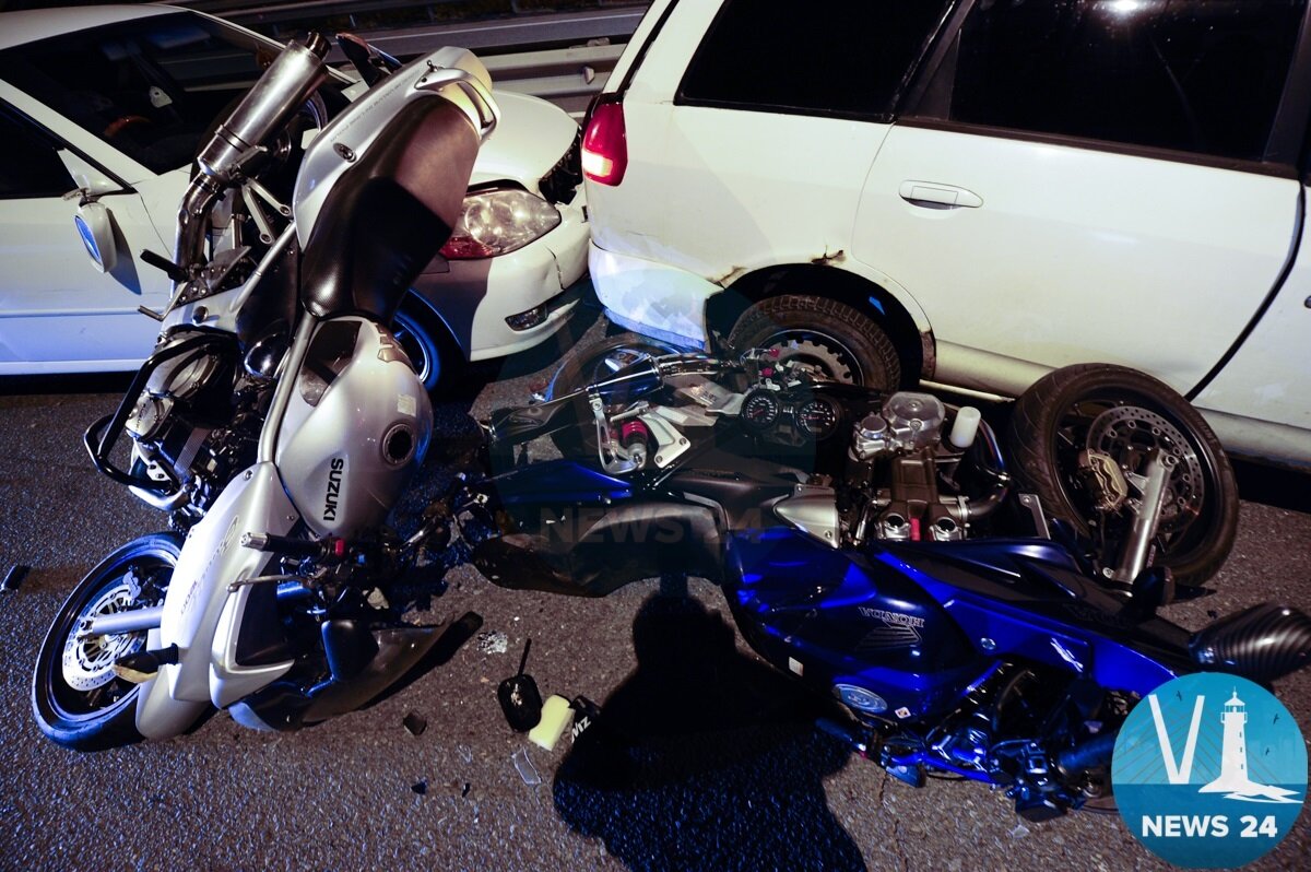 На трассе Патрокл-Седанка в результате столкновения 4 транспортных средств погиб байкер. Как стало известно нашему корреспонденту, водитель Wingroad двигался по первой полосе, Mark 2 по левому ряду позади в метрах 20 от универсала. Со слов хозяина седана, мотоцикл Honda (синий - прим.ред.) обогнал Mark 2 слева и начал притормаживать во втором ряду, после чего байк завилял и он ударил Wingroad в заднюю часть, последний отлетел в леер разделительной полосы. Затем Mark 2начал тормозить, но все равно врезался в универсал. И последним столкнулся с седаном мотоцикл Suzuki. В результате происшествия, хозяина Honda откинуло на леерное ограждение и он упал на асфальт. Прибывшие врачи констатировали смерть мужчины. В обстоятельствах произошедшего разбираются следователи полиции.