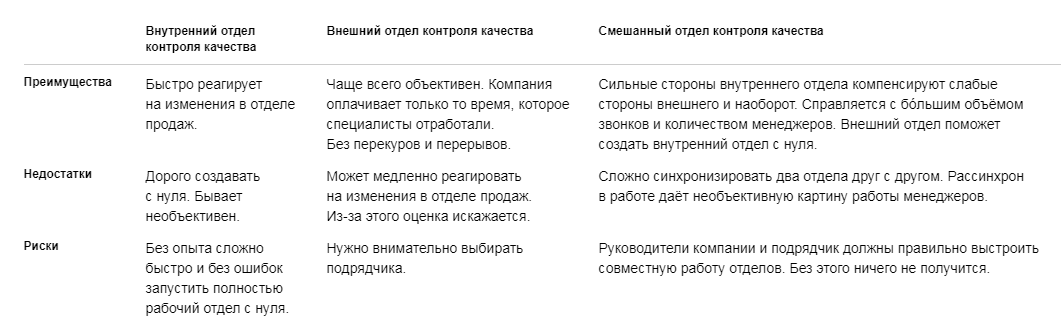 Отдел контроля качества звонков и коммуникаций находит ошибки менеджеров по продажам и помогает улучшать их работу. Если у вас ещё нет такого отдела, можно нанять подрядчика. Но это не единственный вариант: вы можете создать собственный отдел или смешать два отдела вместе.