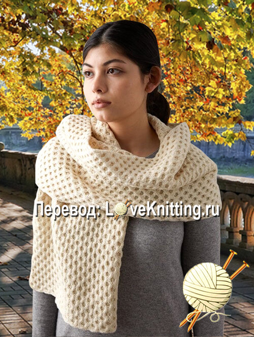 Выразительная шаль от дизайнера Jamila Modeste выполнена текстурным узором «соты», с которым справится даже самая неопытная рукодельница. Размер: 38 см х 163 см ВАМ ПОНАДОБИТСЯ УЗОРЫ Узор «соты» (число п. кратно 8 п. + 4 п.): см в описании модели. ПЛОТНОСТЬ ВЯЗАНИЯ Узор «соты»: 36 п. и 38 р. = 10 см х 10 см Описание На спицы № 3,75 набрать 140 п. и вязать: ряд (изн. сторона): снять 2 п., нить перед работой, изн. п. до конца р. Продолжить работу спицами № 4 и вязать: 1-й р. (лиц. сторона): снять 2 п., нить за работой, * 4 лиц. п., перекрещ. направо, 4 лиц. п., перекрещ. налево, повт. от * до последних 2 п., 2 лиц. п.; 2-й р. (изн. сторона): снять 2 п., нить перед работой, изн. п. до конца р.; 3-й р.: снять 2 п., нить за работой, лиц. п. до конца р.; 4-й р.: снять 2 п., нить перед работой, изн. п. до конца р.; 5-й р. (лиц. сторона): снять 2 п., нить за работой, * 4 лиц. п., перекрещ. налево, 4 лиц. п., перекрещ. направо, повт. от * до последних 2 п., 2 лиц. п.; 6-й р.: снять 2 п., нить
