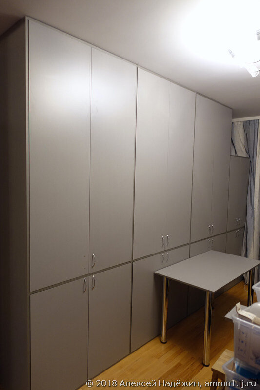 Я осознал, что никаких шансов избавиться от коробок в комнате, разобрав их содержимое, у меня нет. И тогда я решил построить огромный шкаф, шириной 3.7 метра, высотой 2.63 м и глубиной 62 см. Он состоит из четырёх секций, в нём 25 полок. Правая секция ниже - над ней кондиционер.