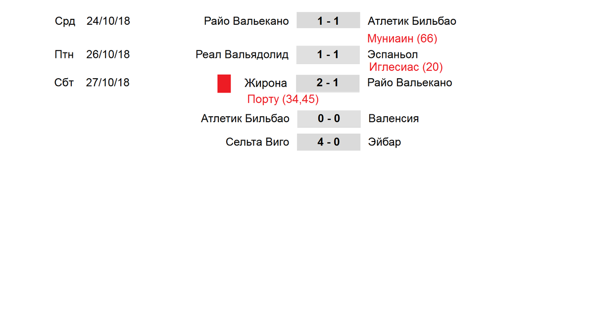 начнем наш обзор результатов, с игры Райо Вальекано Атлетик Бальбао, это была перенесенная игра 3 тура, 1-1. За Атлетик отличился Икер Муниаин, который забил свой 4 гол. После этой игры оба клуба продлили свои без выигрышные серии. У Райо Вальекано она длится 6ю игру, у Атлетика на 1 матч больше. Ну а теперь 10 тур. Вальядолид Эспаньол, и тут тоже 1-1. Борха Иглесиас забил свой 5 гол в чемпионате. А Хозяева спасли игру в компенсированное время. И после этой игры обе команды продлили свои без проигрышные серии, у Вальядолида 6 таких матчей, у Эспаньола на игру меньше. Жирона Райо, на этот раз Вальекано проиграло 2-1. За Жирону дважды отметился Порту, он не португалец, а испанец. После чего Жирона позволила себе 1 мяч пропустить, и в конце ещё остаться в 10м. Таким образом Райо Вальекона не может выиграть уже 7ю игру к ряду в чемпионате. Свою 2ю игру за 3 дня провел и Атлетик, и также как и Райо продлил без выигрышную серию. Она равна уже 8 игр. голов в этом матче не было. Валенсия у