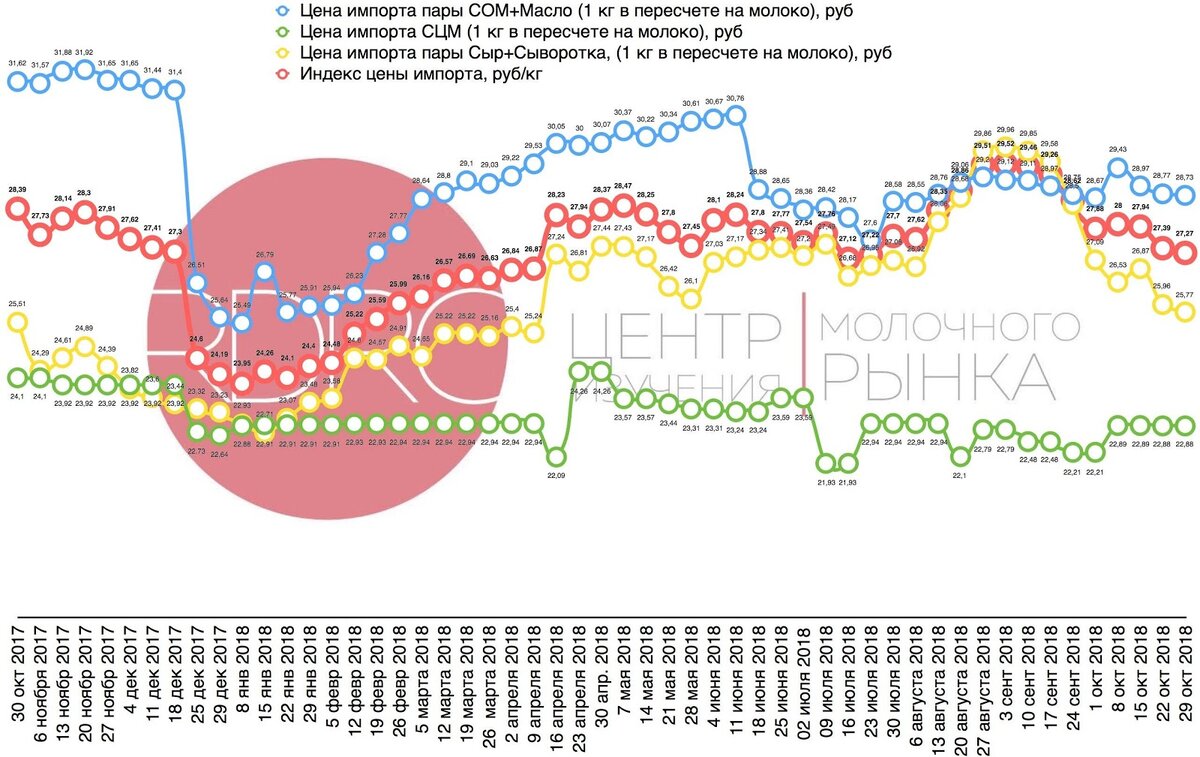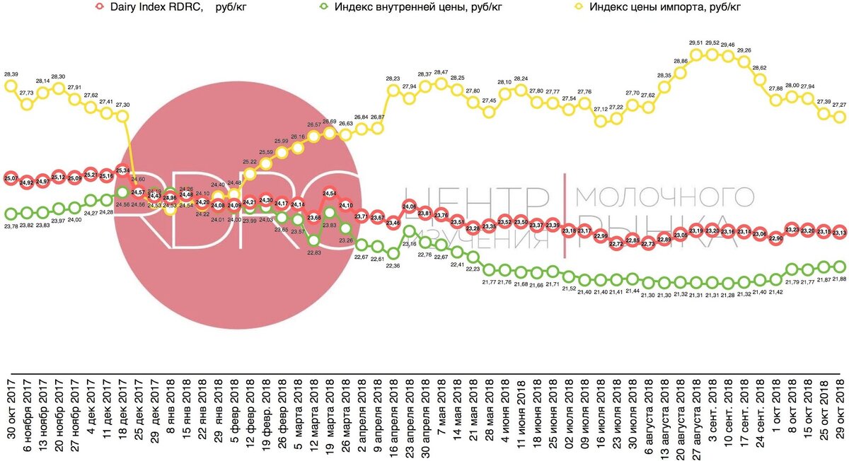 Dairy Index RDRC снизился до 23,13 руб/кг Dairy Index RDRC на 29 октября 2018 года составил 23,13 руб/кг (без НДС, жир-3,6%, белок-3,0%), на 0,09% ниже показателя начала прошлой недели и на 7,74% ниже конца октября 2017 года. На динамику индекса продолжает оказывать ключевое влияние снижение цен на биржевые молочные продукты и растущий курс рубля, фактором сдерживающим падение индекса является умеренный рост цен на молоко в российских регионах согласно приложению Index RDRC. По данным приложения Index RDRC средневзвешенная цена на молоко в России на прошлой неделе выросла на 0,05% до 21,88 руб/кг, что на 8% ниже цены конца октября 2017 года. На прошлой неделе выросли цены на молоко в некоторых регионах, например, в Кировской области, Пермском крае. Напомним, что для получения доступа к информации о ценах на сырое молоко во всех регионах России, пользователям необходимо пройти регистрацию на странице приложения Index RDRC и еженедельно вносить актуальные да