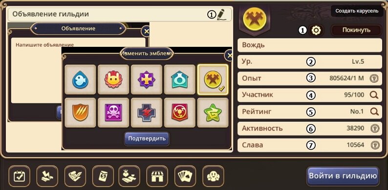 Изменение Объявления и Эмблемы гильдии доступно Офицерам и выше.