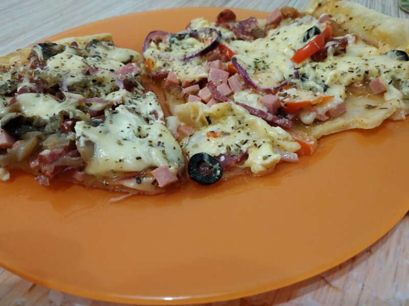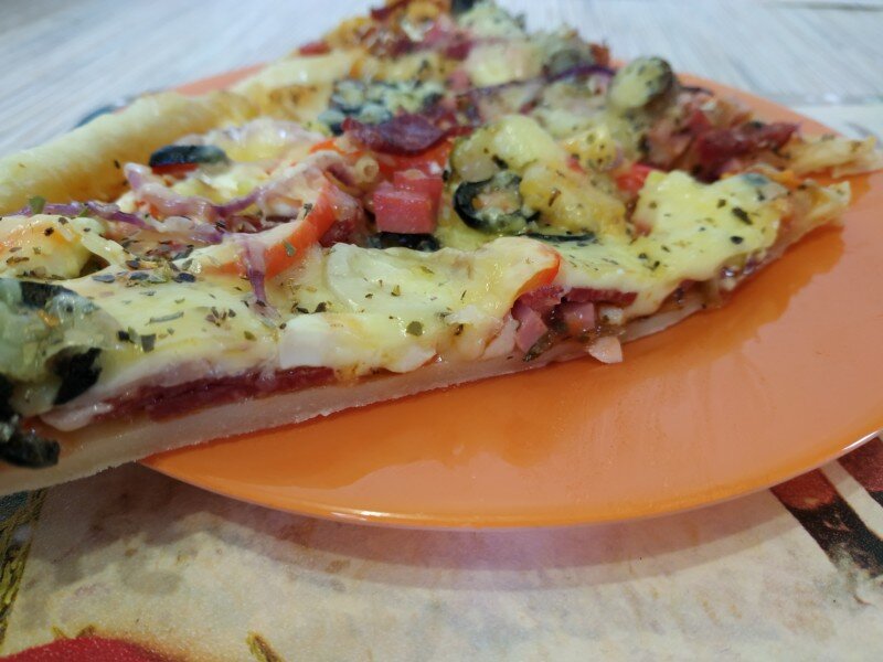 Привет друзья! Пишет Денис Повага. Хочу поделиться своими секретами приготовления безумно вкусной пиццы, которая не то чтобы как в пиццерии получается, а гораздо гораздо вкуснее. Без шуток! Рецепт, который опишу ниже — проверенный, и вы 100% можете следовать по нему, чтобы удивить родных и близких. Праздничная пицца "Обжорка" Пришло время поделиться супер рецептом, пиццы Обжорки. Это не Маргарита, а её продвинутая версия. С начинкой из колбасы, помидор, сыра, болгарского перца, оливок и маринованного огурца. На фото справа: Ингредиенты на большую пиццу — «Обжорка»: Уже чувствуете, какая сытная начинка получается? Ого-го… Попробуйте!Сборка пиццы делается равномерно:укладываются все ингредиенты… Предпоследний слой — майонез, и после натертый твердый сыр: Пицца посыпанная сыром. Завершающий этап: Отправляем в духовку на 10-20 минут (зависит от мощности), и когда сыр расплавится, буквально за 5 минут до готовности, посыпаем приправой — Орегано. Представьте, что вы солите блюдо. Поэтому