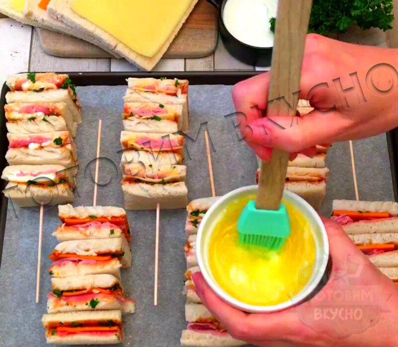 Внезапно пришли гости? Или вы собираетесь на природу и не знаете, чтобы приготовить вкусненького для пикника? Хотите побаловать себя вкусным завтраком, а все банальное уже надоело? Выход из всех этих ситуаций крайне просто - шашлыки из бутербродов. Он чрезвычайно аппетитно выглядит, очень сытный и невероятно быстро готовится! Если вы хотите окончательно удивить гостей, то в конце статьи вы найдете рецепт куриных крылышек в медовом соусе! Продукты: специальных хлеб для сэндвичей; сыр любого сорта, можно использовать пластинки для бутербродов; сыр темного сорта, чеддер, мимолет или другой, он нужен не только для вкуса, но и для красоты итоговых шашлычков: бекон, ветчина, то, что вы предпочитаете; зелень по вкусу; яйцо для смазки; майонез и горчица. *Количество продуктов берете на свое усмотрение, все зависит от того, сколько в результате шашлычков должно у вас получиться. Способ приготовления: 1. Обрезаем края у хлеба, смазываем его поочередно майонезом и неострой горчицей. 2. Вы