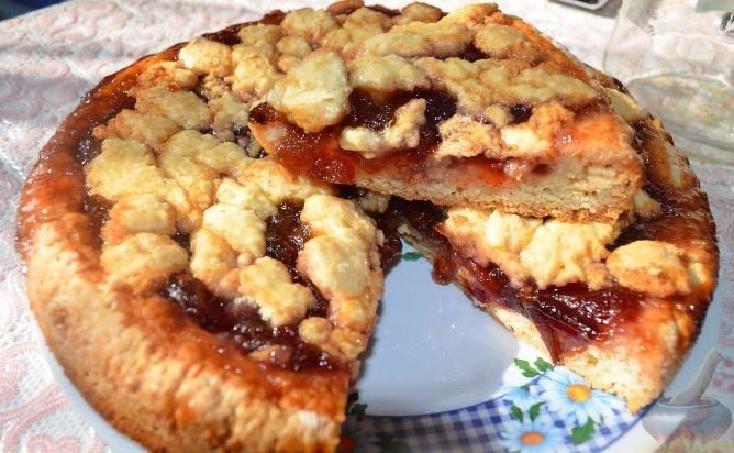 Яйца взбейте миксером с сахарным песков в пену. Маргарин растопить на водяной бане и соединить со сметаной и взбитыми яйцами, добавьте соду (НЕ ГАСИТЬ!) и муку. Должно получиться некрутое тесто. Разделите тесто на 2 части (большая и поменьше). Уложите на противень, смазанный сливочным маслом, большую часть и растяните её по всей поверхности, формируя бортики. Сверху положите варенье. Возьмите вторую часть теста, отрывайте от неё небольшие кусочки и укладывайте, немного вдавливая, в произвольном порядке. Таким образом, у пирога получится ажурный верх. Выпекать пирог в разогретой духовке до 200 градусов 30-35 минут до образования румяного цвета. ПРИЯТНОГО АППЕТИТА! Если Вам понравилась статья, ставьте лайк и подписывайтесь на мой канал в Я