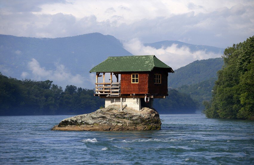 В данной статье я бы хотел рассказать об удивительных и уникальных домах со всего мира: от деревенских домов до пещерных, от приютов в форме футбольных мячей до домов в форме униформы и т.д. Итак начнем, 1. Деревянный Дом, построенный на крошечной скале на реке Дрина Этот дом находится около западного сербского города Баджина Баста, примерно в 160 км от Белграда. Дом был построен в 1968 году группой молодых людей, которая решил, что скала на реке будет идеальным местом для небольшого приюта. Основой для создания этого дома послужила идея группы смелых молодых спортсменов создать для себя место отдыха посреди речки. Изначально, после упорных водных тренировок, они просто отдыхали на этой скале, но в последующем им захотелось более лучшего, удобного и комфортного. Как итог - на этой скале появились первые доски. Через год с небольшим один из группы спортсменов предложил проект данного чудо-дома. Строительные материалы перевозились своими силами на байдарках и лодках, а особо крупные –