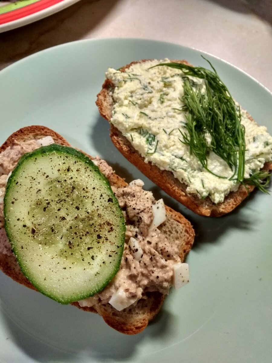 5. намазать массу на тосты, сверху положить тонкие кружочки огурца, пресыпать черным молотым перцем и можно подавать