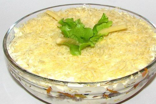 Невозможно устоять перед таким вкусным и аппетитным салатом. Так и манит попробовать! Готовлю постоянно на все праздники! Мужчины от него без ума! Приготовление: Для того, чтобы приготовить салат "Любовник", нам сначала нужно обжарить на сливочном масле 250 гр шампиньонов. Грибы солим по вкусу. Салат слоеный. Каждый слой смазываем майонезной сеточкой. Первый слой - одна баночка рыбных консервов. Лучше всего подойдёт горбуша, сайра или сардины, но можно использовать любую другую. Убираем косточки, разминаем вилкой и выкладываем на блюдо. Вторым слоем идут обжаренные грибы, третий - одна небольшая измельченная луковица. Четвёртый слой - одна натертая на терке морковь. Пятый слой - тертый сыр, достаточно будет 100гр. Отправляем салат "Любовник" в холодильник на 2-3 часа, чтобы он пропитался. И подаем на стол. Приятного аппетита!