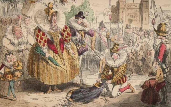 …Здесь-то и происходит, согласно легенде, исторический эпизод с плащом – эту свою главную ценность нищий капитан бросит в лужу, перед которой нерешительно переминалась в атласных туфельках сама королева. (Между прочим – и это важно! – сопровождавшая в тот момент испанское посольство… хотя, прагматики полагают, что Елизавета присмотрела Рэли ещё раньше, во время, собственно, доклада – уж очень был хорош собой…) Так или иначе – наш герой немедленно становится рыцарем; получает дворец, поместье – и кучу экономических бонусов: патент на винный откуп; оловянную монополию; лицензию на экспорт шерсти… одним словом – не просто «поднимается», но прямо-таки, возносится… (Что, само собой, возбуждает сильнейшее неудовольствие в «обществе» – фаворит быстро приобретает репутацию мота и высокомерного гордеца).