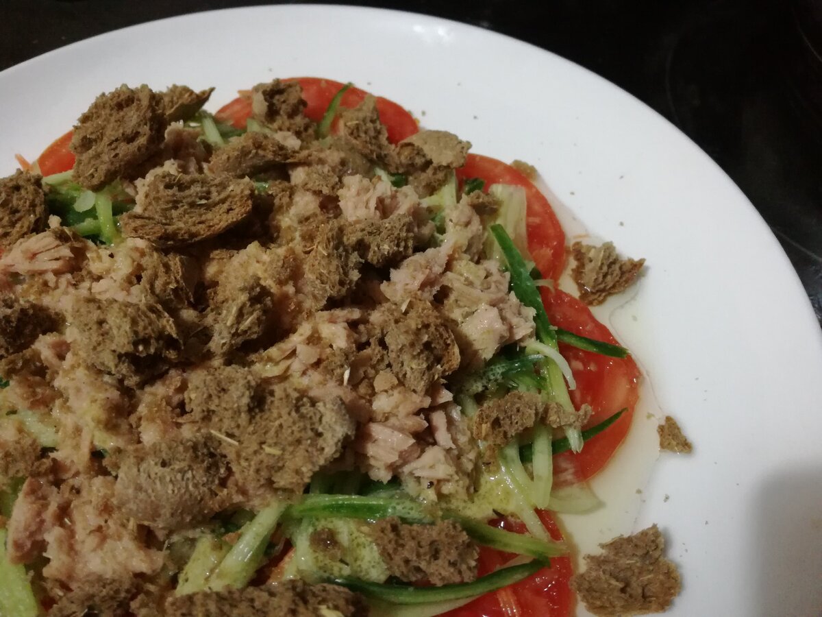Очень вкусный и эстетически красивый для подачи салат! Если вы ждете гостей или вам предстоит романтический ужин-это то, что нужно! Рецепт как всегда прост, не требует сложных ингредиентов и легко готовится, итак-поехали... Нам понадобится: 1\2 банки тунца 1 помидор 1 огурец 1 морковка 1 сухарь 1 ст.л. лимонного сока 1 ч.л. горчицы 1 ст.л. оливкового масла соль, перец Способ приготовления: Помидор нарезаем кружками и выкладываем на плоское блюдо. Сверху натираем резкой для корейской морковки морковь и оругец и распределяем по помидорам Приступаем к соусу: с мисочке смешиваем горчицу, лимонный сок, оливковое масло, соль и перец Поливаем половиной соуса салат, затем выкладываем сверху тунец и сухарики и поливаем второй половиной Подаем к столу и наслаждаемся! Приятного аппетита! :) Если вам понравился рецепт, не забудьте поставить лайк и подписаться на мой канал!