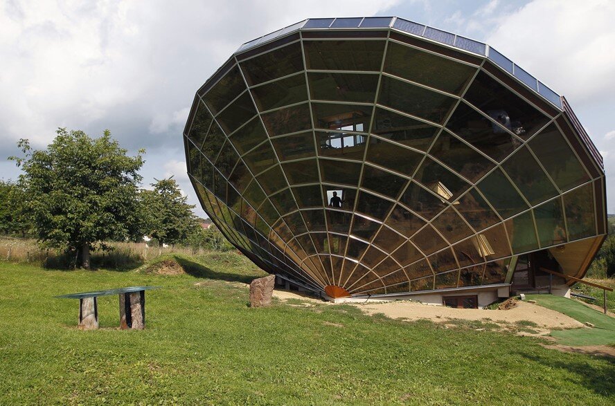 В данной статье я продолжаю рассказывать об удивительных и уникальных домах со всего мира. 3. Гелиодом Heliodome - биоклиматический солнечный дом, построенный в Кошвиллере недалеко от Страсбурга (Восточная Франция) в 2011 году. Он построен в форме гигантских трехмерных солнечных часов, установленных под специально выверенным углом по отношению к солнцу. Данная форма является уникальной и создает тень в летние месяцы, обеспечивая внутри дома прохладу его обитателям, а в зимнее, а также осенне-весеннее время, в дом через огромные окна максимально попадает солнечный свет, нагревая жилые помещения и делая его комфортным для проживания. Т.е. можно сказать, что северная сторона дома (наклонная крыша) спроектирована траекторией солнца во время зимнего солнцестояния, тогда как во время летнего солнцестояния курс солнца следует за фасадом, выходящим на юг. Гелиодом состоит из дерева, бетона и стекла и является результативным решением на энергетические ограничения, существующие в мире, а такж