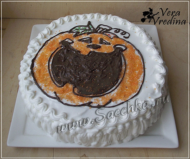 Тыквенный торт приготовлен с кремом из взбитых сливок и украшен на праздник Хэллоуин растопленным шоколадом и сахаром. Ингредиенты: Для крема: Для украшения торта: Как приготовить: