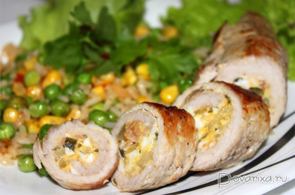 Это удовольствие от хорошо приготовленного вкусного мяса: сочные свиные рулетики с начинкой, обжаренные и запеченные в духовке. Это скорее рецепт выходного дня, когда есть время приготовить мясную вкуснятину, рецепт которой давно присмотрен и ждет своего часа. Нет, этот рецепт не относится к сложным, но времени требует больше, чем, к примеру, обычные отбивные для быстрого ужина. Хороши рулетики тем, что при таком способе приготовления (обжаривание плюс запекание) в мясе сохраняются соки, а вкус его становится богаче. Лучше всего готовить рулетики из корейки или карбонада, но можно так же взять подходящий кусок окорока. Главное - чтобы из куска мяса можно было нарезать довольно тонкие пласты, которые после отбивания станут еще тоньше. У нас был вот такой кусок в 500 с хвостиком граммов, который мы нарезали на горизонтальные пласты, 5 штук. Чтобы не устраивать себе проблем с такой нарезкой, можно поперек волокон поделить кусок на стейки потолще, которые несложно будет сделать больше з