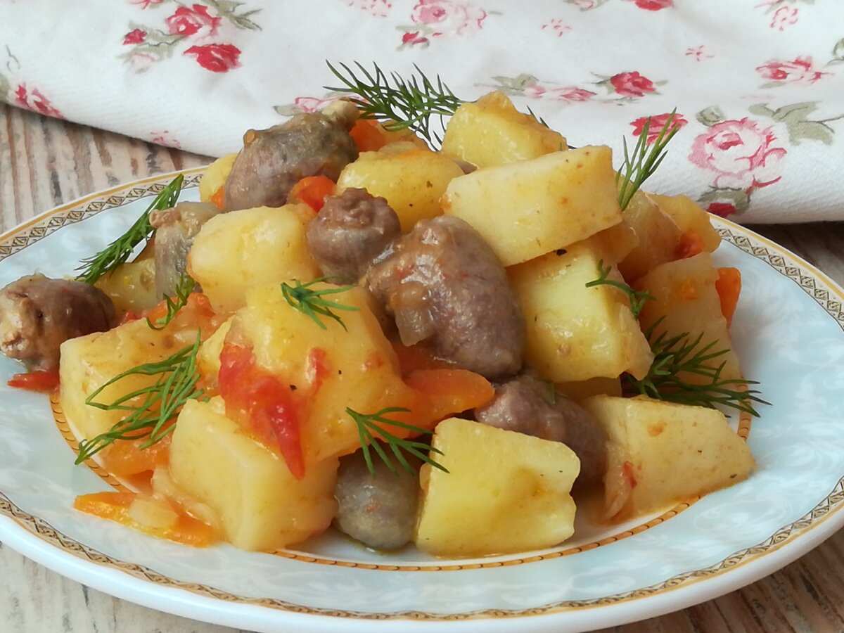 Последнее время буквально "подсела" на субпродукты... Вчера вот на ужин тушила картошку с овощами и куриными сердечками. Конечно, найдутся такие, которые субпродукты вообще не воспринимают как еду, но, тогда этот рецепт не для вас... А зря! И, это даже не про пользу субпродуктов... Во-первых, все блюда готовятся очень быстро, а во-вторых это вкусно! И, в этот раз я приготовила ужин за 30 минут... Где уж будете приобретать куриные сердечки, это ваше сугубо личное дело... Я, например, покупаю !!!только Не сочтите это за рекламу!!! В Пятёрочке! Вот сколько бы раз не покупала в этом магазине и куриные сердечки, и печёнку, и разделанную курицу, всегда всё чистенькое, вымытое... Но, продолжу... Я для приготовления взяла полкило куриных сердечек, вы можете взять и больше, здесь пропорции продуктов особой роли не играют, главное, как я уже сказала, сердечки нужно хорошо помыть. Если сердечки крупные, их можно порезать пополам. Теперь берем кастрюлю или казан, подходящего размера, наливаем в н
