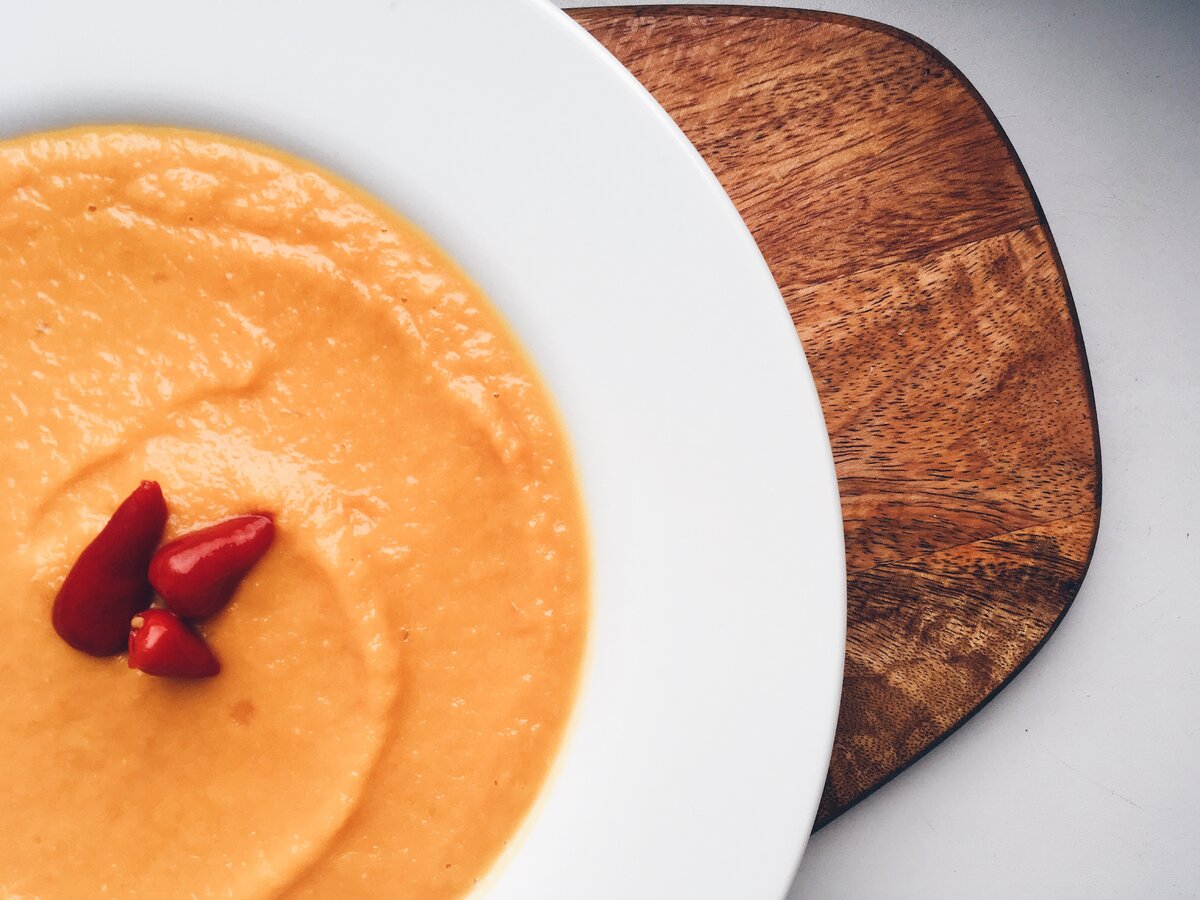 Тыквенные супы просто готовить, и они при этом всегда выглядят эффектно из-за своего насыщенного оранжевого цвета и кремовой текстуры. Что нужно для приготовления супа: 600 гр тыквы 1 головка лука 1 морковь 2 зубчика чеснока 1, 5 см свежего имбиря 2 ст. л Оливковое масло 2 ст. л меда Соль по вкусу Перец черный по вкусу Приготовление Очистите тыкву, порежьте на крупные куски и смешайте с медом. Сбрызните тыкву оливковым маслом и заверните в фольгу. Запекайте 30-40 минут в духовке при температуре 180 ℃. Мелко нарежьте лук, натрите морковь и обжарьте их на среднем огне с оливковым маслом. В конце жарки лука, добавьте к нему мелко нарезанный чеснок и имбирь, готовьте еще минуту. Готовую тыкву переложите в кастрюлю (2 литра) и залейте водой так, чтобы вода полностью покрывала тыкву. Варите 10 минут без крышки, затем добавьте готовую зажарку, соль, перец и проварите еще минут 5. Взбейте суп блендером! Приятного аппетита!