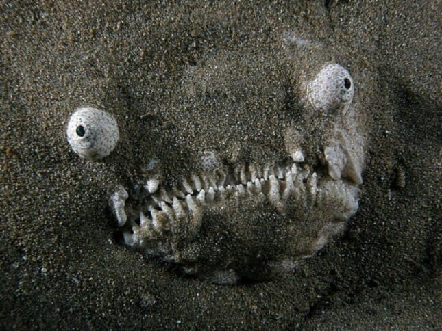 ЗВЕЗД0ЧЕТ Свое название она получила из-за своего внешнего вида. И вправду, очень уж она необычная. Её глаза смотрят вверх, как будто она рассматривает небо и считает звезды. У нее есть и другие названия: морской дракон, морская корова. Обитает в илистых и песчаных берегах, зарывается там, оставляя на поверхности только выпуклые глаза. В длину тело рыбы звездочета достигает 30 см и имеет форму веретена. Верхняя часть рыбы окрашена в серо - коричневый цвет, что помогает ей оставаться незамеченной во время охоты. Питаться мелкой рыбой, моллюсками, червями, которые по неосторожности приблизились к месту ее охоты. Рыба звездочет очень не привлекательной внешности: Сближенные, выпуклой формы глаза. Приоткрытый рот с рядом мелких острых зубов. Выступающая нижняя челюсть. Черный спинной плавник с четырьмя колючками–шипами. На жабрах длинных ядовитый шип. Над каждым грудным плавником есть ядовитые иглы. Яд звездачета, если уколоться, доставит вам сильную боль. И ногда приводит к печальны