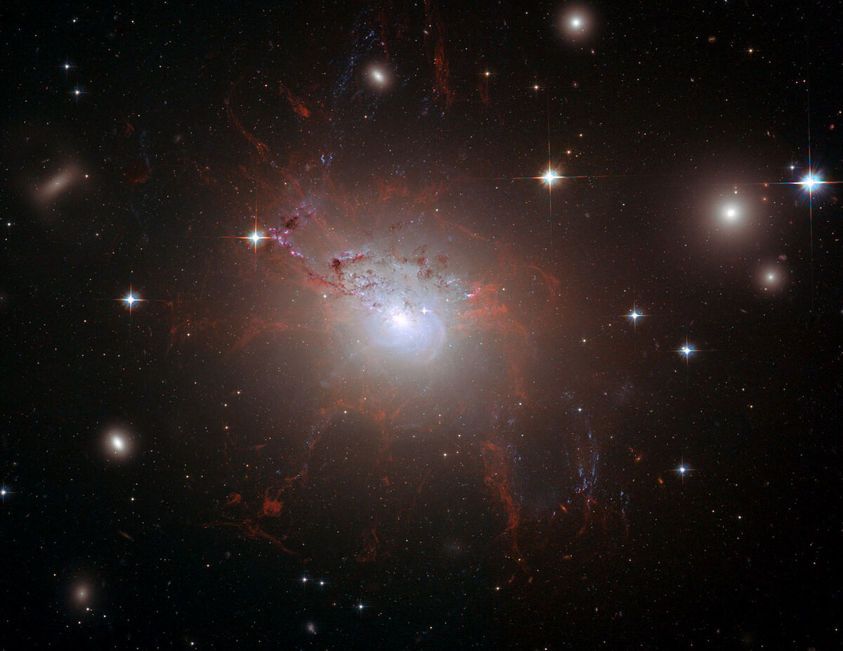 Из центральной области галактики выбрасываются массивные облака разогретого вещества (красный цвет). Вдоль объекта расположилось основное вещество, которое формирует звезды и планеты.