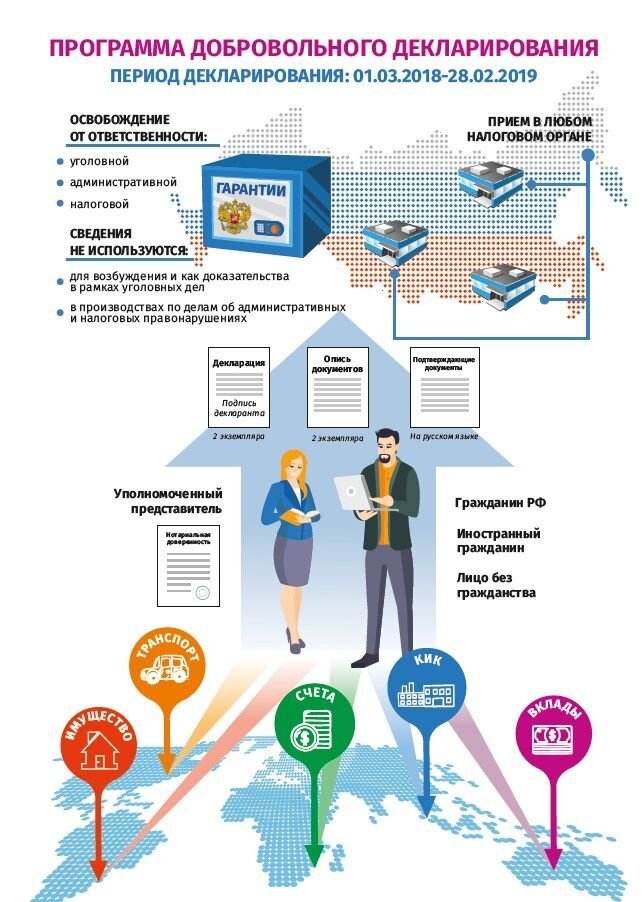 С 1 марта 2018 года по 28 февраля 2019 года в соответствии с Федеральным законом от 8 июня 2015г. № 140-ФЗ «О добровольном декларировании физическими лицами активов и счетов (вкладов) в банках и о внесении изменений в отдельные законодательные акты Российской Федерации» Вы можете сообщить о своих зарубежных активах и счетах в налоговый орган по месту жительства или в ФНС России. Добровольное декларирование направлено на освобождение от ответственности за ранее совершенные нарушения налогового, таможенного и валютного законодательства, а также позволяет передать активы от номинального владельца бенефициарному (реальному) владельцу без уплаты налога. Форма специальной декларации и порядок ее заполнения и представления размещены на официальном сайте ФНС России www.nalog.ru в разделе «Специальная декларация» (https://www.nalog.ru/rn77/taxation/specdecl/). ФНС России обеспечивает конфиденциальный режим хранения поданных специальных деклараций, не имеет права пере