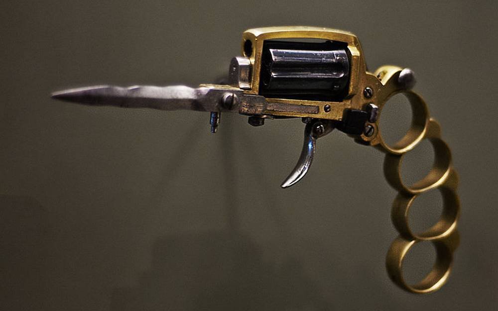 Одним из самых интересных, и при этом достаточно известным примером странного оружия является револьвер Apache. Этот уникально универсальное оборудование была разработана во второй половине XIX века в Бельгии и позволял на выбор оружия в зависимости от ситуации. В случае драки мог быть просто кастетом, но когда появилась необходимость использования чего-то более, его вы сможете использовать нож или в крайнем случае из огнестрельного оружия. Из-за отсутствия ствола Apache был, вероятно, очень кое-как и годится только для боя на короткой дистанции. Изготовлено более 4 тысяч. экземпляров этого пистолета. К старой концепции вернулись во время второй мировой войны – отдельные искусства подобного оружия были использованы британскими коммандос.