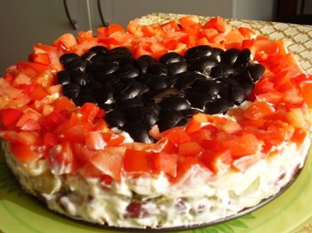 Очень вкусный и сытный салат, который не оставляет никого равнодушным. Готовлю его на праздники и не надоедает! Записывайте рецепт! Приготовление: Салат "Коварство и любовь" выкладываем слоями. Каждый слой (или через один) смазывается майонезом. Первым идет вареная говядина - 300 гр. Второй - одна нарезанная луковица. Третий - 1 банка консервированной красной фасоли. Четвертый - маринованные огурчики, 3-4 шт. Их нарезаем кубиками. Пятый слой - отварной картофель 3 шт, также режем кубиками. Завершающий слой один помидор и оливки. Оливки выкладываем по центру в форме сердечка, остальное пространство по краям заполняем нарезанными помидорами. Соль в салат добавьте по вкусу. Ставим на 2-3 часа в холодильник, чтобы салат пропитался. Приятного аппетита вам!